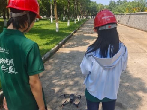 线上攻坚的同时,科技之翼正上阵助力维修检测,配电抢修组的成员跟随师傅沿线巡检电线基杆,排查故障关键点位,在发现肉眼无法判断是否出现问题时果断采取更细致化作业——利用无人机开展巡检,载有高清摄像头的无人机喧鸣而起,每一片可能开裂的绝缘子,每一处或许熔断的熔断器都在显示屏中一览无余。“放大点,快看这里的绝缘子侧方有裂纹!”操作队员迅速标记点位并拉近镜头,师傅结合实时画面和经验果断做出判断,记录并上报。实践队员们的“火眼金睛”不放过任何一处异常状态,一个个疑似问题都在左右晃动的摇杆和按下的检查快门声中被排除。