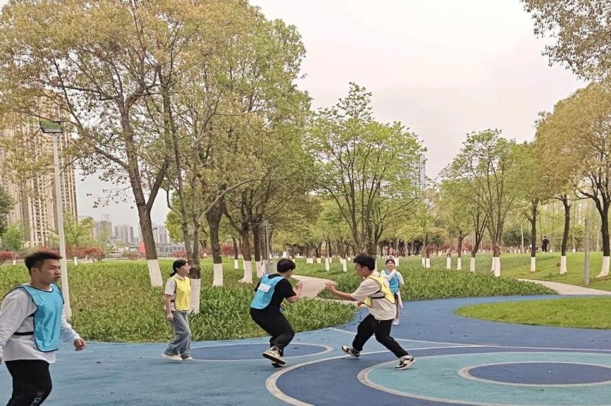 随后,同学们一起进行了“撕名牌”游戏,纷纷化身为“猎人”与“猎物”,在公园空地上你追我赶,尽情释放青春的能量。