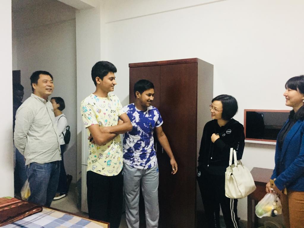一进留学生公寓,就看到四名孟加拉国的学生在汉语角弹吉他,他们非常有礼貌,热情地邀请老师们参观他们的房间。随后,院领导走访了2018级秋季入学的新生宿舍,并向他们送去了代表着学院温暖与情谊的水果。在走访的过程中,亲切地询问了新生们来校后学习及生活情况,关切地询问了同学们的家乡在哪里,是否能适应长沙的气候和饮食,并一一解答了学生们提出的问题。