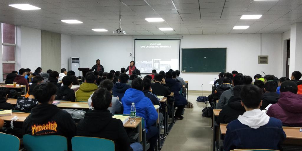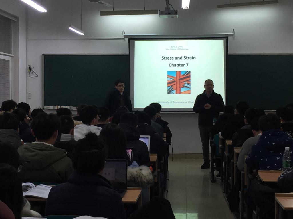 本次引进的6门课程为Foundation Analysis and Design、Transporataion II(2015级),Civil Engineering Materials、Design of Concrete Structures(2016级),Mechanics of Mateials、Dynamics(2017级),分别由美国田纳西大学诺克斯维尔分校的黄宝山教授,美国田纳西大学查塔努加分校的Fomunung Ignatius教授、Onyango Mbakisya副教授、吴卫东博士、Owino Joseph教授承担,并由我校国际学院陈瑜,土木工程学院任宜春、潘军、曾明华、尹平保,以及交通运输工程学院刘喜敏等6位老师担任引进课程助教工作。中外任课教师均表现出很强的敬业精神,克服了时差和恶劣天气的影响,精神抖擞提前到教室上课。中外合作项目同学们也展现了良好精神面貌,上课认真听讲,积极参与课堂互动。