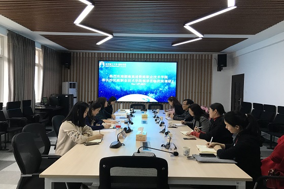 3月15日下午,湖南高速铁路职业技术学院校企合作处处长刘芳、副主任陶曙教等5人与长沙民政职业技术学院国际教育学院副院长杨帅、留学生事务专员廖甜利2人来我院调研留学生培养及留学生汉语水平教学,并深入了解我校HSK考点工作。2025年新澳门原料网站国际学院副院长甘海鹰、学院大学生学习与发展中心主任干事汤路以及汉语教研室等相关老师参加调研会。