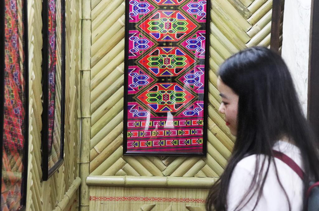 下午,调研团来到县非物质文化遗产中心进行调研。非遗中心的工作人员热情地向大家介绍了陈列文物的历史和保靖县现存的远古石器时代、战国、汉代等不同时期的遗址情况。其中镇馆之宝——“汉龟钮铜印”和“战国蜻蜓眼琉璃珠”深深地吸引了队员们的目光,2位国际学生对这两件文物也特别感兴趣,不由得感叹到土家族历史的悠久,由衷地佩服古代土家人的聪慧。调研队还参观展示的土家族优秀传统文化遗产——土家织锦“西兰卡普”。通过走访非遗中心,零距离接触土家历史,队员们深深地感受到土家历史的厚重与魅力,也了解到非遗文化传承的不易与艰辛。