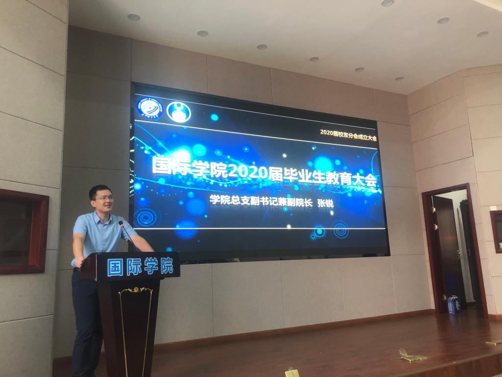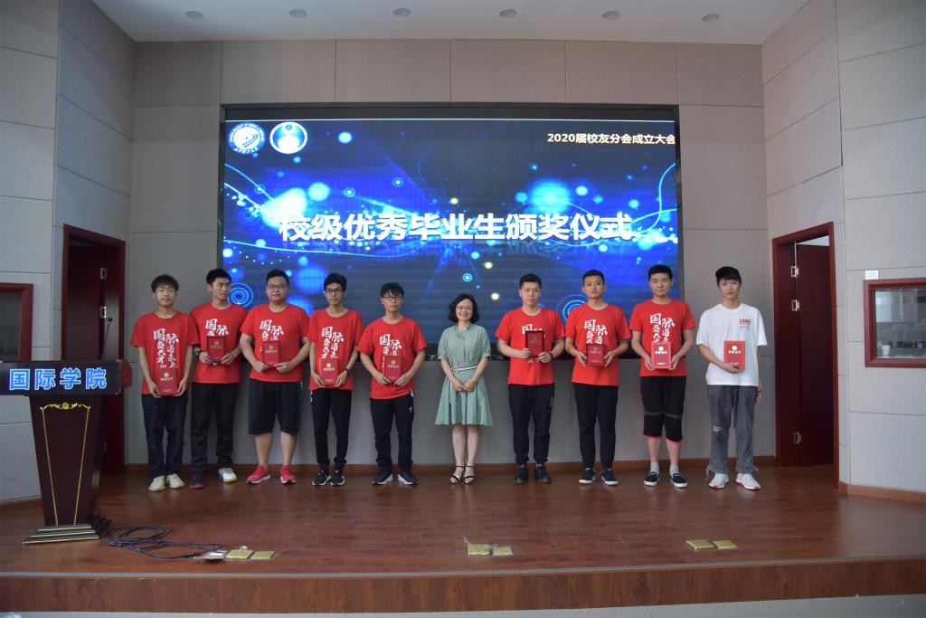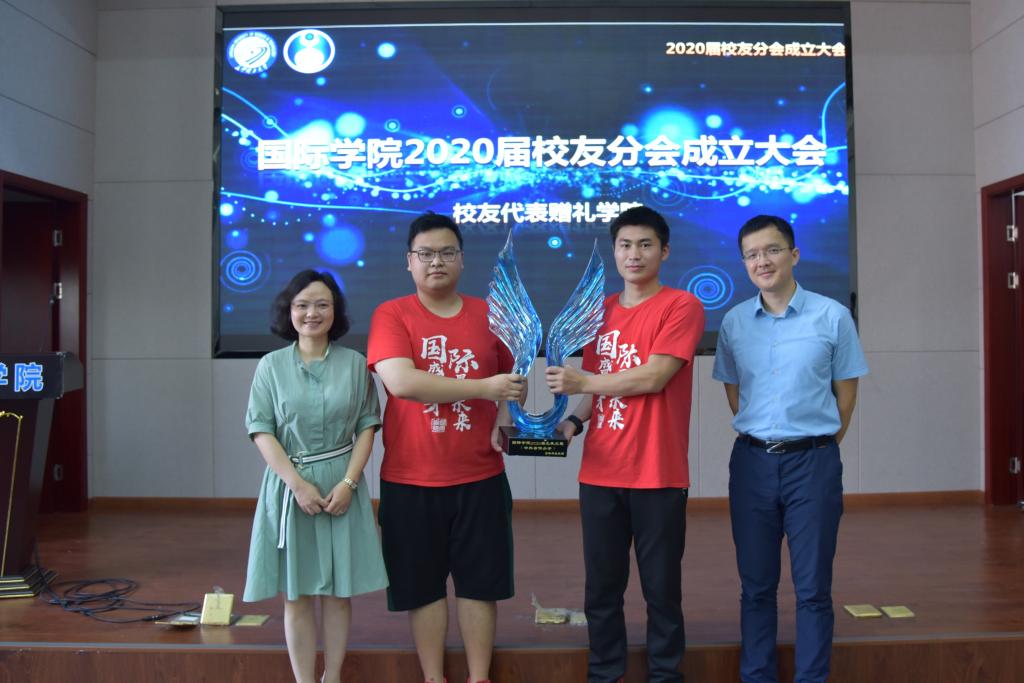 在2020届校友分会成立大会上,陈瑜代表学院发表致辞,向毕业生们表示热烈祝贺,希望全体毕业生毕业后继续发挥国际青年的优良品质,“求知若饥,虚心若愚”,积极促进中外交流与合作,到祖国最需要的地方建功立业。接着,张锐宣读《关于成立国际学院2020届校友分会的通知》,为2020届校友分会授旗。陈瑜和全体辅导员分别为10名校级优秀毕业生颁发证书,为全体毕业生赠送毕业纪念大礼包。随后,2020届校友分会代表向学院赠送纪念礼物。毕业生张微东代表全体毕业生向学院和母校多年的辛勤栽培表示衷心感谢,表示将不负学院厚望,在接下来的学习和工作中继续发扬长理人的“铺路石”精神,为国家发展贡献青春力量。
