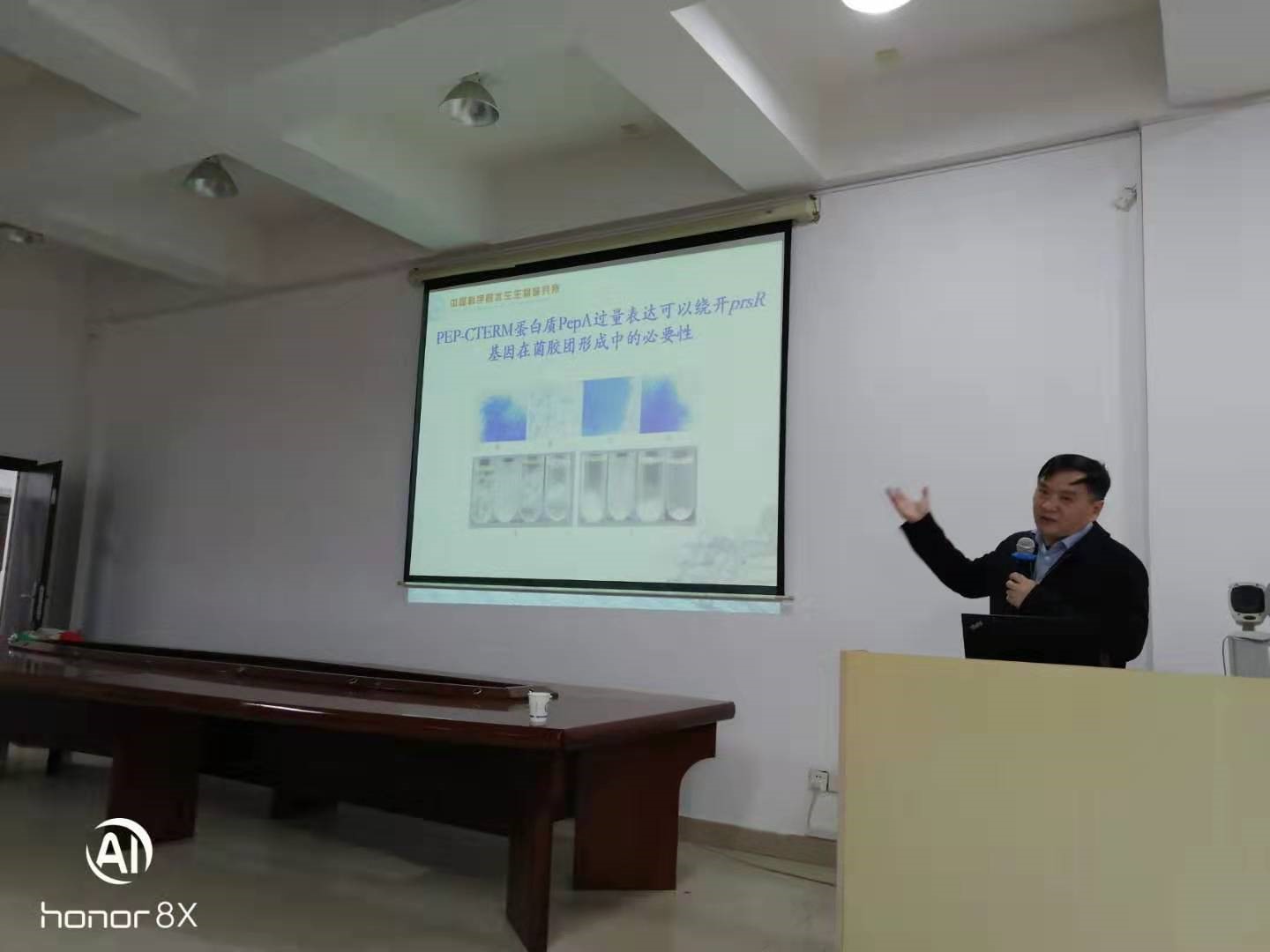 然后,邱教授重点阐述了从全球污水厂活性污泥分离到的28个核心种属微生物,介绍了该课题组从全国各地的污水厂分离出来的菌种及其分子特征,能定性到种的有2000多株。他们第一次用分子遗传的方法研究阐述了菌胶团形成的“网中鱼”模型,生动解释了胞外多糖的合成与转运,提出了调节PEP-CTERM蛋白质表达和菌胶团形成的二组分系统PrsK-PrsR和信号转导途径模型,准确地揭示了菌胶团形成菌的机制,其作用规律以及其系统的结构。相关结果发表在环境科学领域顶级期刊Water Research及Environmental Microbiology上。同时提出了富集大部分营养物质的剩余污泥问题将是未来重点解决的方向。老师和同学们就自己所关注的问题与邱教授进行了充分的互动与交流,如是否用别的碳源代替葡萄糖来培养微藻。化学学院环境工程专业的产学研合作单位--湖南惟创环境集团的工程师郑松也来到现场报告会,他就公司污水运行当中遇到的实际问题与邱老师和同学们进行了交流,与大家进行了分享。