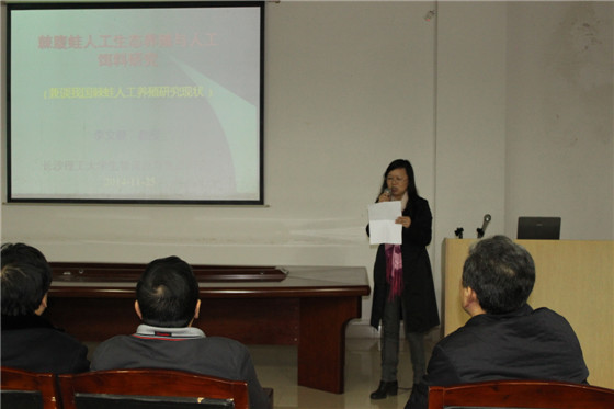2014年11月25日(星期二)下午14:30,生物资源与生态研究所所长李文健教授(二级)在云塘校区工科三号楼A-320室开展题为“棘腹蛙人工生态养殖与人工饵料研究( 兼谈我国棘蛙人工养殖研究现状 )”的学术讲座,程云辉院长、曹忠书记、王明彦副院长以及生物工程专业的老师、相关专业的研究生和本科生80余人认真聆听了报告。