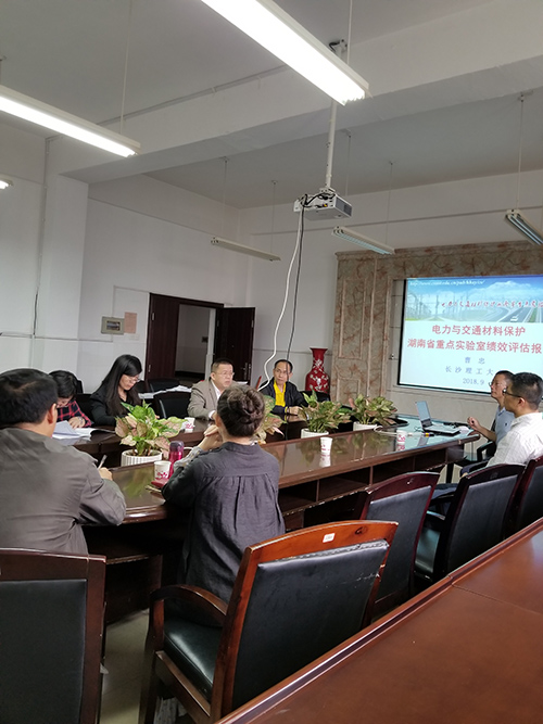 首先,重点实验室主任曹忠教授从重点实验室基本信息、主要建设成绩、代表性研究成果、队伍建设与人才培养、开放交流与运行管理及中长期发展设想等方面进行了详细汇报,重点介绍了“电力与交通材料保护”湖南省重点实验室在2014-2016年间的发展和成果。随后,专家组认真地审阅了评估材料,并就自评报告中的一些细节问题,与重点实验室骨干成员进行了广泛交流;最后,专家组实地考察了实验室场地、仪器设备、运行管理等方面的情况。