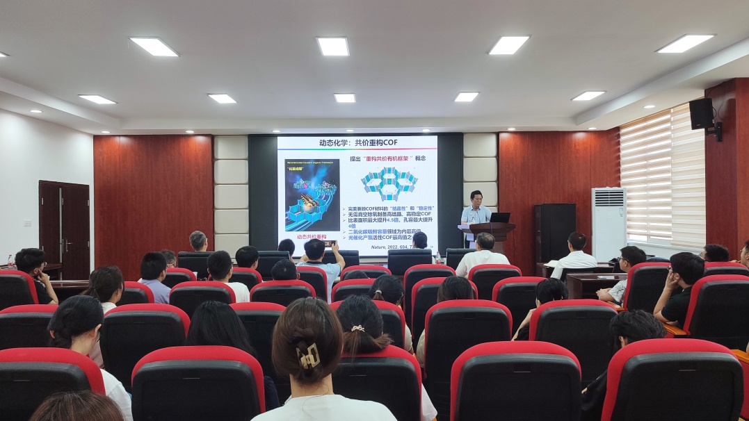 朱为宏教授分别从光敏化学产品的背景、研发目标、设计过程和产业化等方面进行了深入浅出的阐述,详细介绍了有机光敏剂纳米化宏量制备、位阻型烯桥光敏体系、共价重构COF材料等方面的工作。报告结束后,朱为宏教授与师生开展了热烈的讨论,朱教授鞭辟入里地回答了老师们的问题,并针对青年教师基金项目的撰写等方面提出了宝贵的建议,让在座师生受益良多。