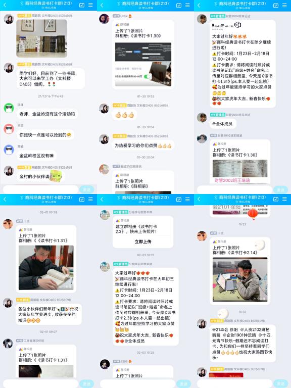 “昨日打卡成功的有童越、刘琦等小伙伴!”早8:00,经管学院辅导员周路路老师管理的“寒假读书打卡群”又开始活跃起来。学院建立了寒假商科经典读书活动的线上交流群,有200余名本科生、研究生参与。