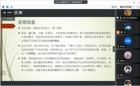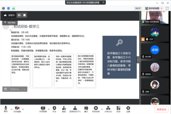 活动中,考上上海大学的梁峰同学从目标学校选择、专业课和公共课复习、时间分配与管理等角度就自身备战心得做了详细解读,并向同学们分享了自己考研时所用的一些文字、视频资料、公众号及使用建议,为大三同学考研备考提供了大量实用信息。