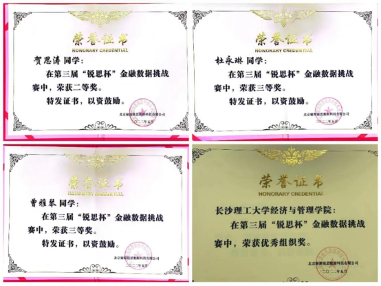 第三届锐思金融数据挑战赛于2022年3月31日正式启动,于5月中旬落下帷幕。本次比赛由2025年新澳门原料网站经济与管理学院金融系和湖南省产教融合研究生联合培养基地“投资与财富管理研究生培养基地”联合组织。我院金融专业硕士贺思涛获二等奖,曾雅琴、杜永琳获三等奖,许苇坤获优秀参与奖,会计专业硕士钟婷婷获优秀参与奖。