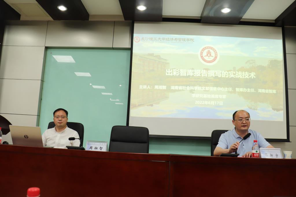 6月17日上午,湖南省社会科学院文献信息中心主任、智库办主任、湖南省智库学研究基地首席专家周湘智研究员应邀来院讲学,做了题为《出彩智库报告撰写的实战技术》的专题报告。学院副院长张新华、刘坚,以及教师代表、研究生100余人参加了本次讲座。讲座由副院长彭新宇教授主持。
