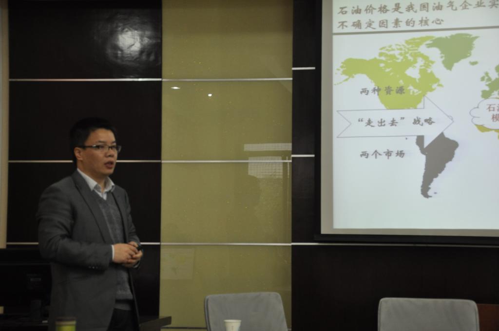 讲座伊始,张跃军教授阐述了他主要的三个研究方向,分别为石油资产定价与预测、碳交易与碳减排战略和能源经济复杂系统建模,表明石油价格是我国油气企业实施“走出去”战略面临的各种不确定因素的核心。