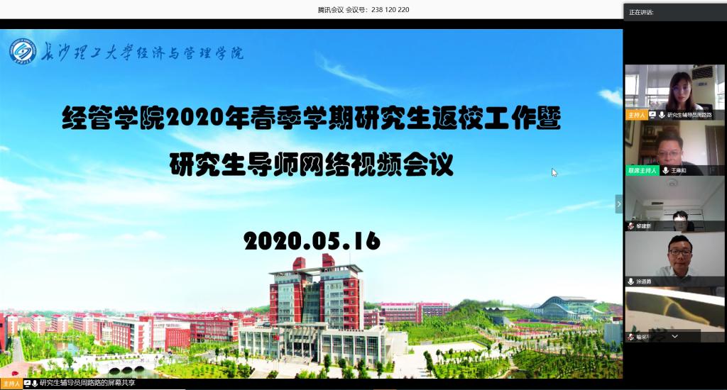 2020年5月16日下午3:30,经管学院召开2020年春季学期研究生返校工作暨研究生导师网络视频会议,全体院领导、全院研究生导师、研究生办和学工办全体成员参加了本次会议,会议由院党委书记王宏主持。