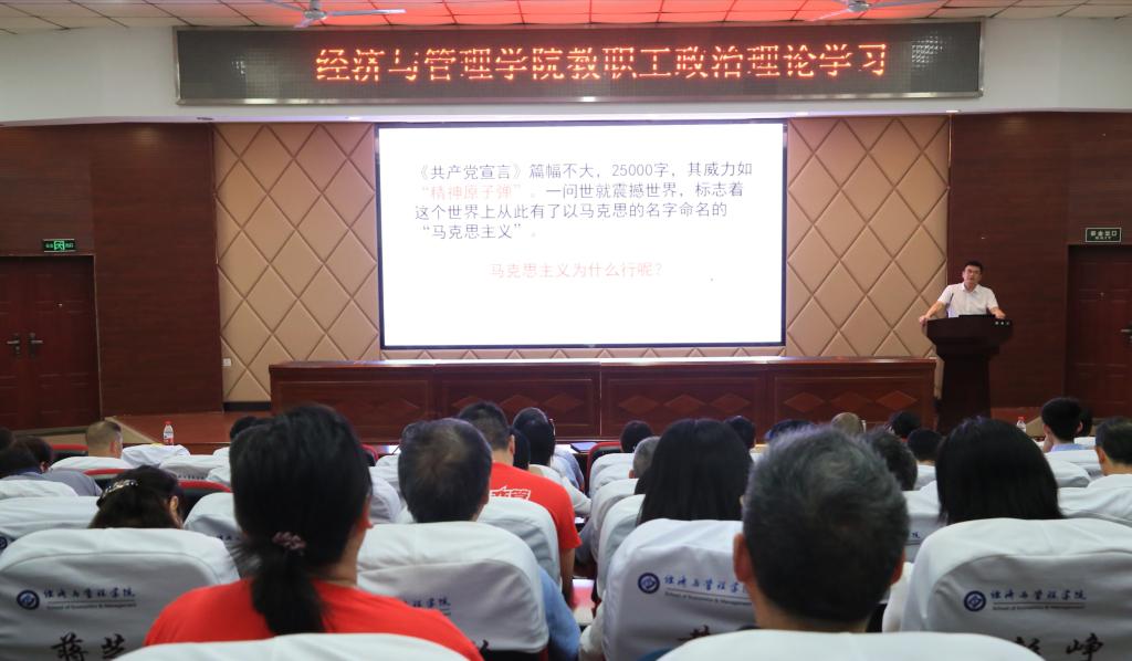 5月11日下午,经管学院全体教职工在文科楼A200进行了集中政治学习,听取马克思主义学院院长陈万球教授的专题报告。政治学习由经管学院党委书记王宏主持。