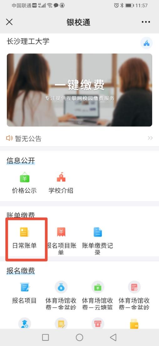 3.进入“银校通”界面一点击“日常账单”;