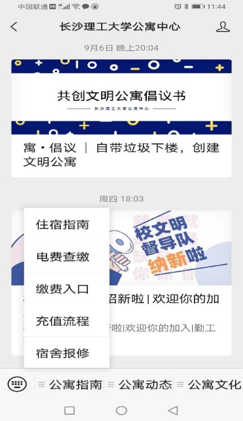 2.点击进入“公寓指南”一 “缴费入口”;
