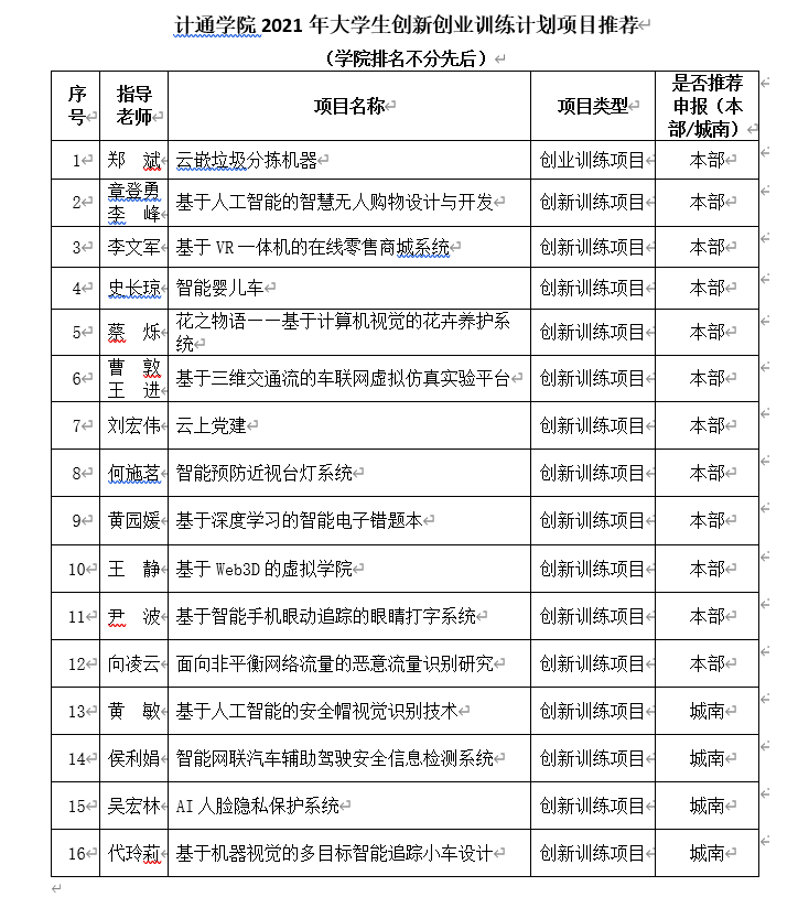 计通学院2021年 “大学生创新创业训练计划项目”评审结果公示
