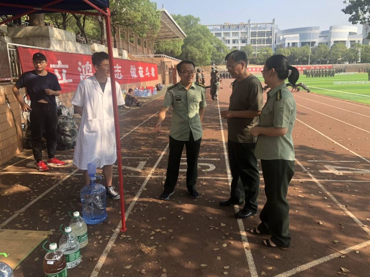 慰问领导们来到队列方阵前,感谢教官几天来辛苦的指导和训练工作,看到教官脸上凝结的汗珠,听到教官洪亮嘶哑的嗓音,陈华认为正是教官的不辞辛苦和散发出来的榜样力量给计通学子带来高昂的士气和斗志。当看到同学们已经动作规范整齐、步调一致,队列初具成效,王建新表示就实际情况来看,本次本科新生军训的效果相对较好,要求同学们一定要有团队意识与集体责任感,为集体的军训汇演奉献出自己的力量,希望同学们在最后的军训汇演上展现计通人应有的气质与风采,为学院争取荣誉。
