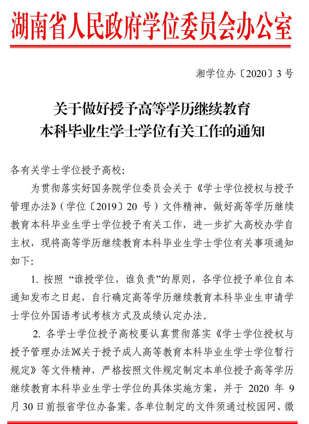 关于做好授予高等学历继续教育本科毕业生学士学位有关工作的通知(湘学位办2020-3号)