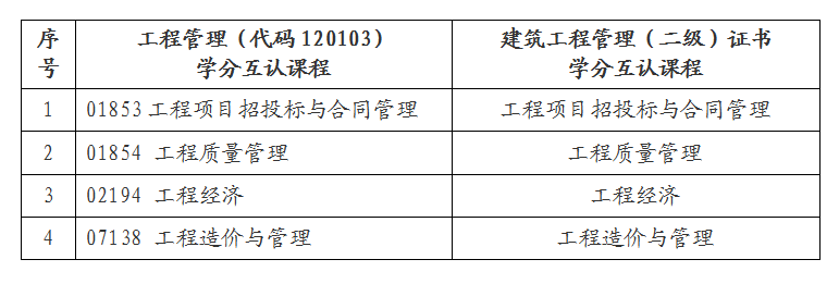 根据湖南省高等教育自学考试委员会办公室通知,我校自考工程管理专业(本科,代码120103)获批开展职业技能证书课程学分互认。即日起开始招生,详情请咨询继续教育学院自考一部(电话:85647210)。具体互认课程如下 :
