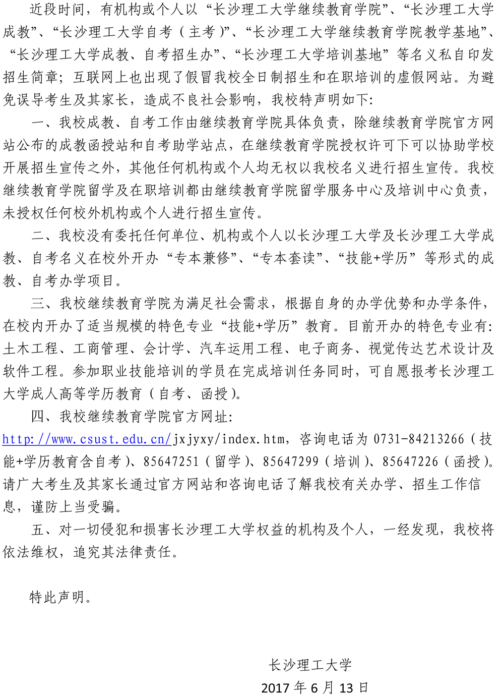 关于对个别机构或个人假冒和盗用我校名义虚假招生的申明