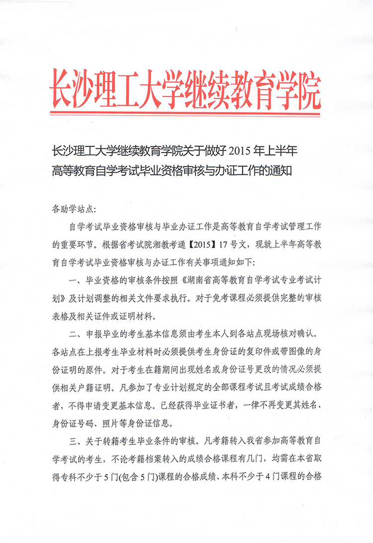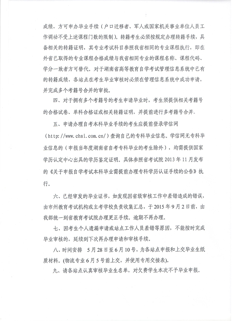 【湖南自考】关于做好2015年上半年高等教育自学考试毕业资格审核与办证工作的通知