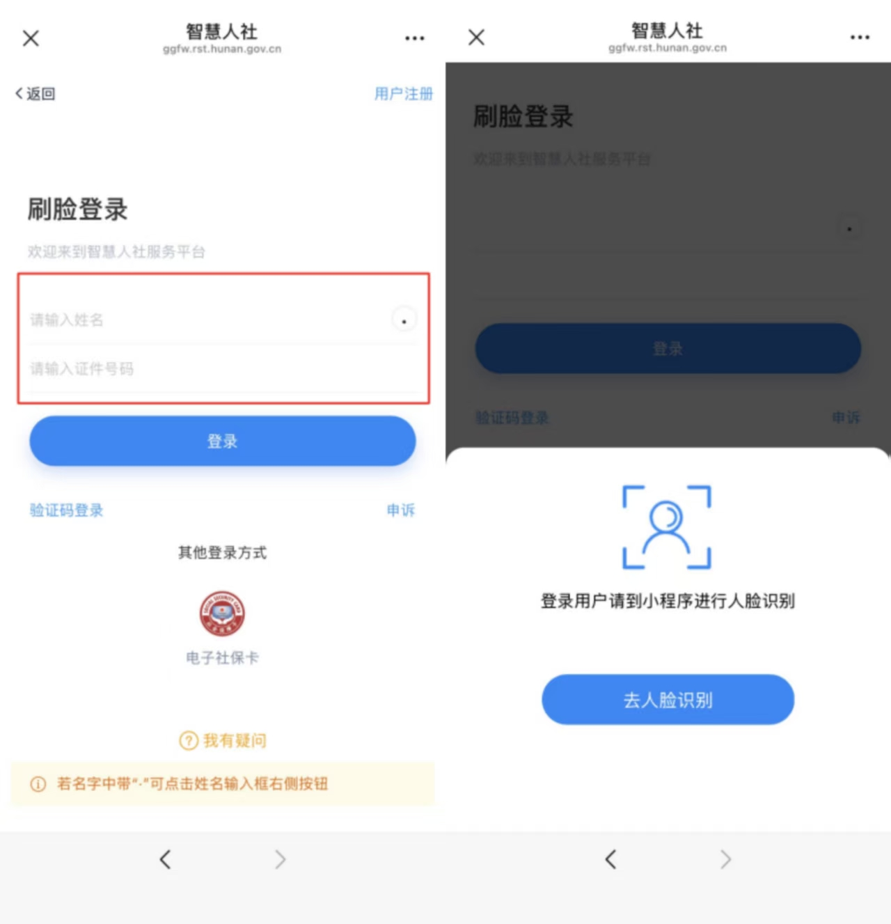 3、输入姓名、证件号登录,跳转小程序完成人脸识别;