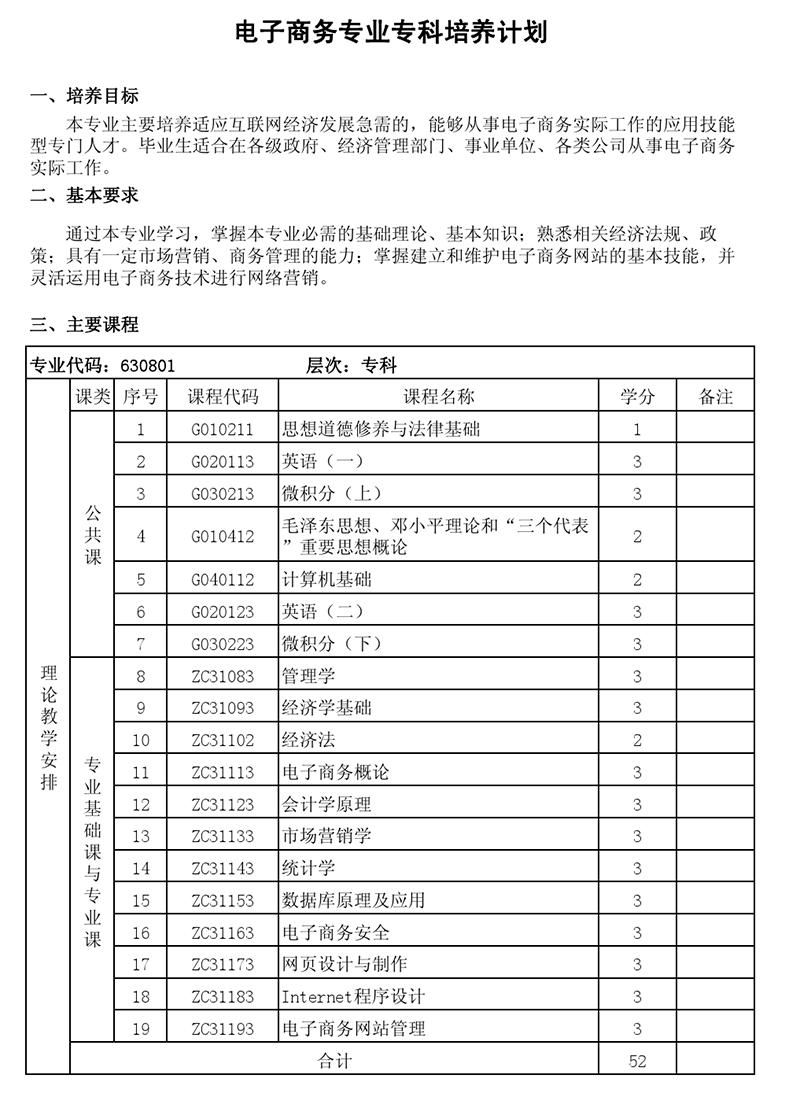 专科培养计划-专业代码:630801 电子商务专业