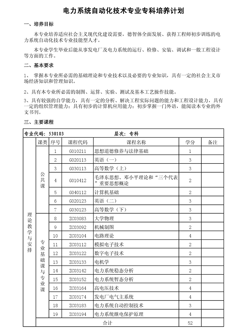 专科培养计划-专业代码:530103 电力系统自动化技术专业