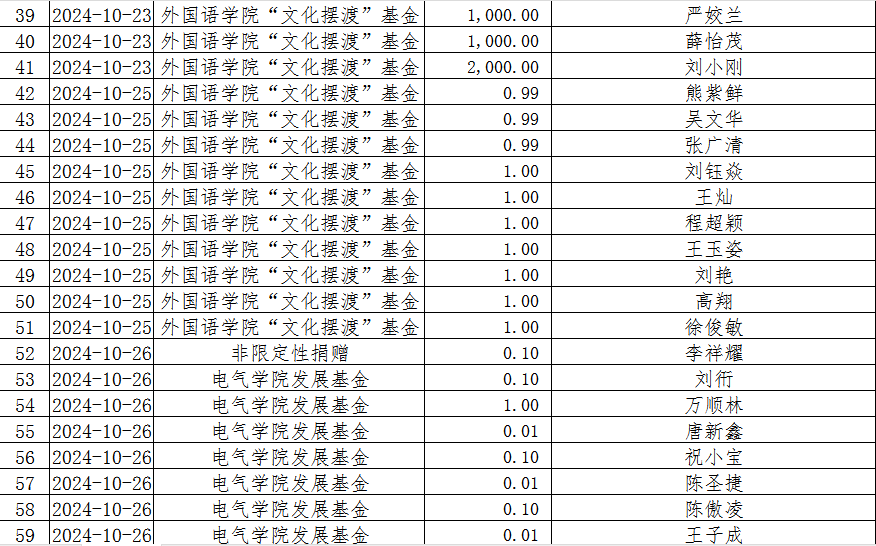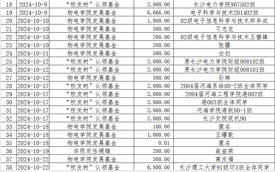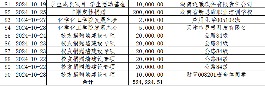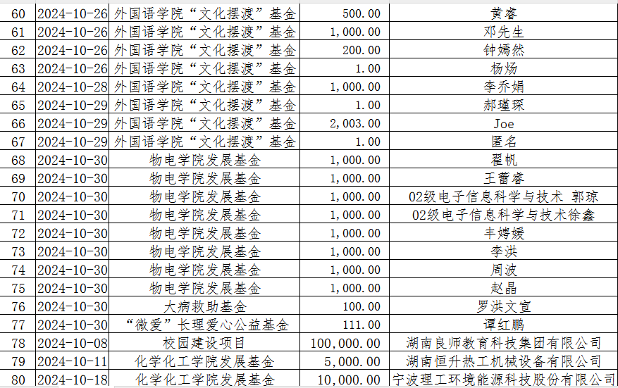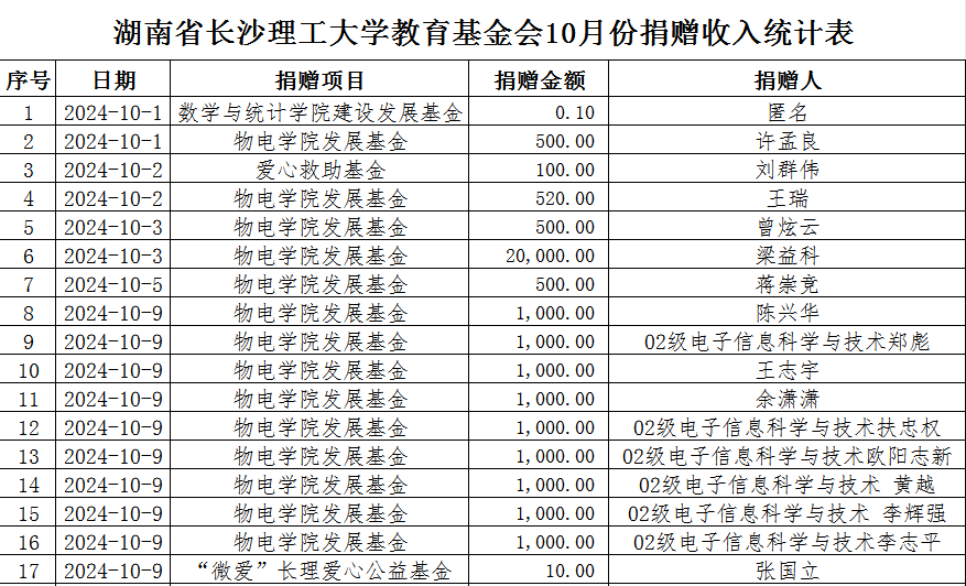 湖南省2025年新澳门原料网站教育基金会2024年10月捐赠收入表