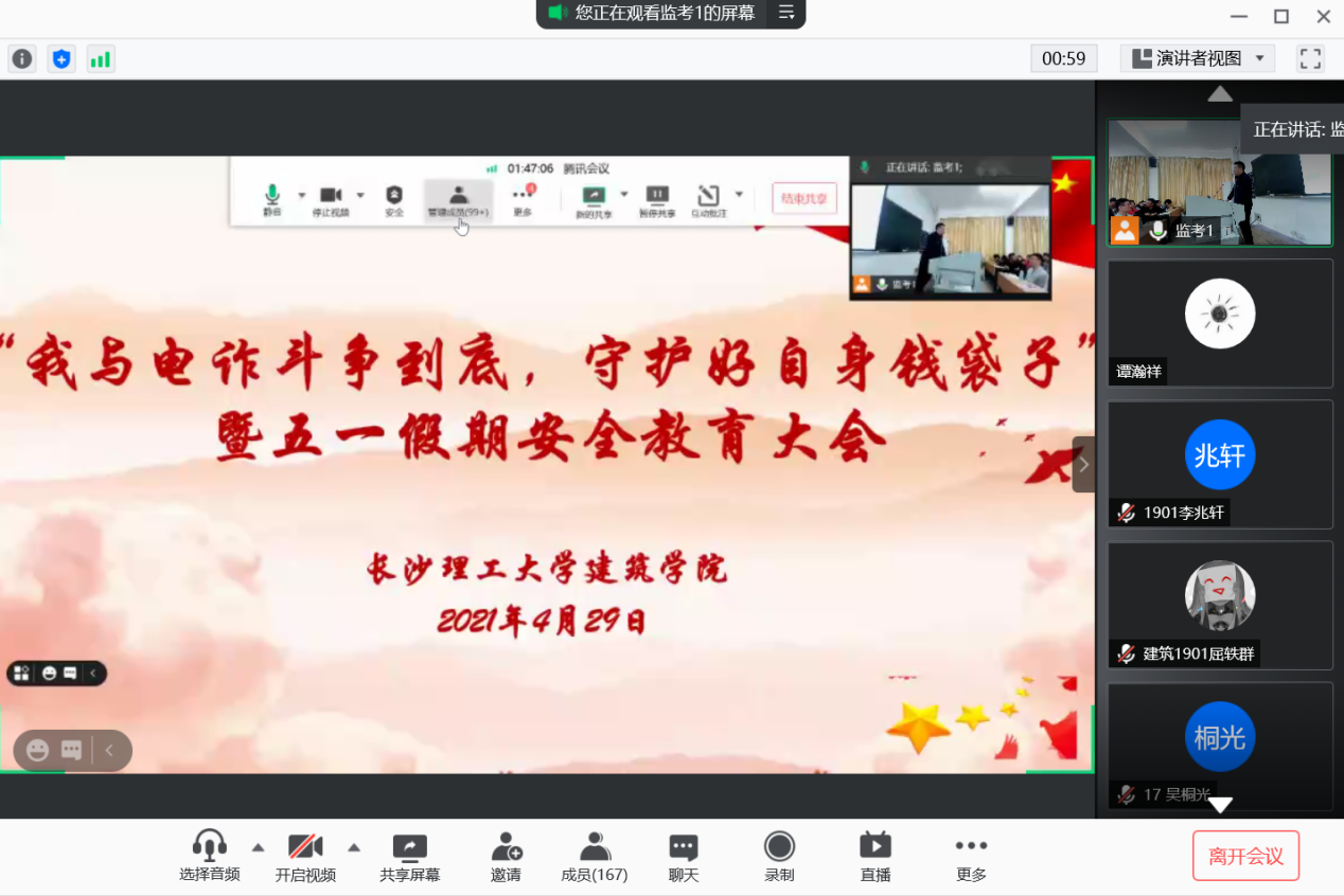 4月29日中午12:50,建筑学院全体本科生、研究生召开了电信诈骗专题暨五一假期安全教育大会,本次会议于金盆岭校区16教召开,外出实习的研究生通过腾讯会议同步观看学习,学工办郭恒老师主持了本次会议。