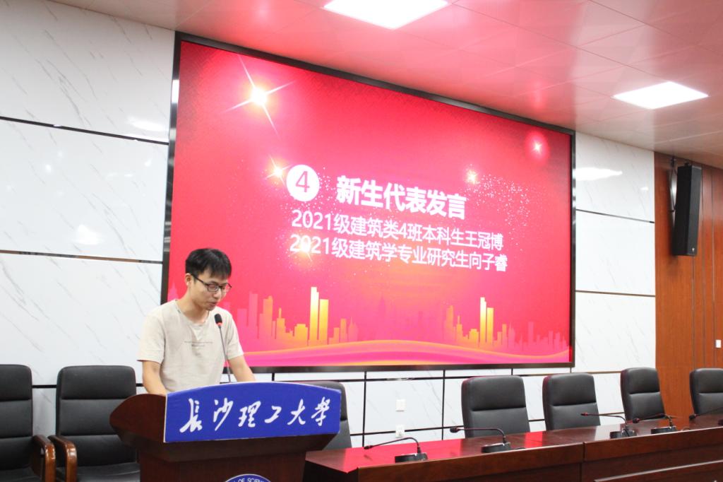 建筑学院党委书记熊鹰教授对2021级142名本科生和27名研究生的到来表示热烈欢迎,恭喜他们正式加入建院大家庭,求学之路道阻且长,希望每一位建院学子都能够“立大志、明大德、成大才、担大任”。班主任代表建筑学系易宇老师,以自身求学的经历为主线,为尚处于迷茫期的新同学们指明了方向。2020级老生代表黄珊同学对自己过去一年的学习、工作和生活做了分享,告诫学弟学妹们,要明确学习目标、制定生涯规划,用奋斗谱写人生华章。2021级新生王冠博和研一新生向子睿,作为新生代表做出了庄严承诺,要立鸿鹄志、做奋斗者,博学笃志、切问近思,永葆乐观、积极向上。副院长周晨教授对全体新生作了五个方面的祝贺并提出了五点希望,希望每个同学都能够找准自己的方向,不负韶华、不负时代。党委副书记谢士成对全体新生表示诚挚问候,希望同学们在未来的学习和生活中,不断的去“发现美、欣赏美、创造美”,早日成为一名德智体美劳全面发展的新时代大学生。