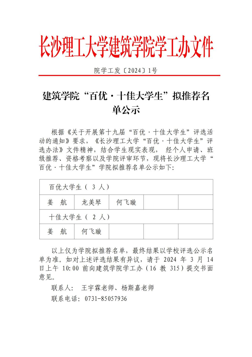 建筑学院“百优·十佳大学生”拟推荐名单公示