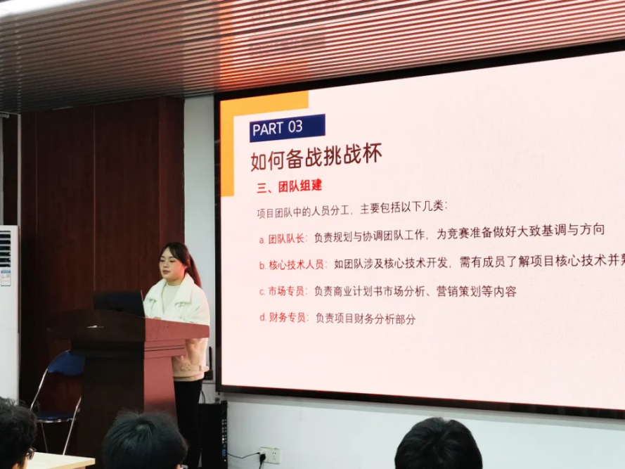 分享会上,多位在“挑战杯”比赛中有丰富经验的建院学子与在场的同学们分享了他们的参赛心得和成功经验。他们从项目选题、团队组建、市场调研、方案策划到最终的项目展示,详细讲述了每一个环节的关键要点和注意事项。江彬彬强调了创新思维在项目中的重要性,要善于从生活中发现问题,并运用创新的方法解决这些问题。并且就如何进行有效的市场调研、如何撰写高质量的商业计划书以及应对比赛中的各种挑战等问题做出了经验分享。肖汉权分享了如何快速找到师资团队和制作PPT的经验。他们认为,一个优秀的团队需要具备不同专业背景和技能的成员,彼此之间要相互信任、分工明确、密切配合,这样才能在比赛中发挥出最大的潜力。