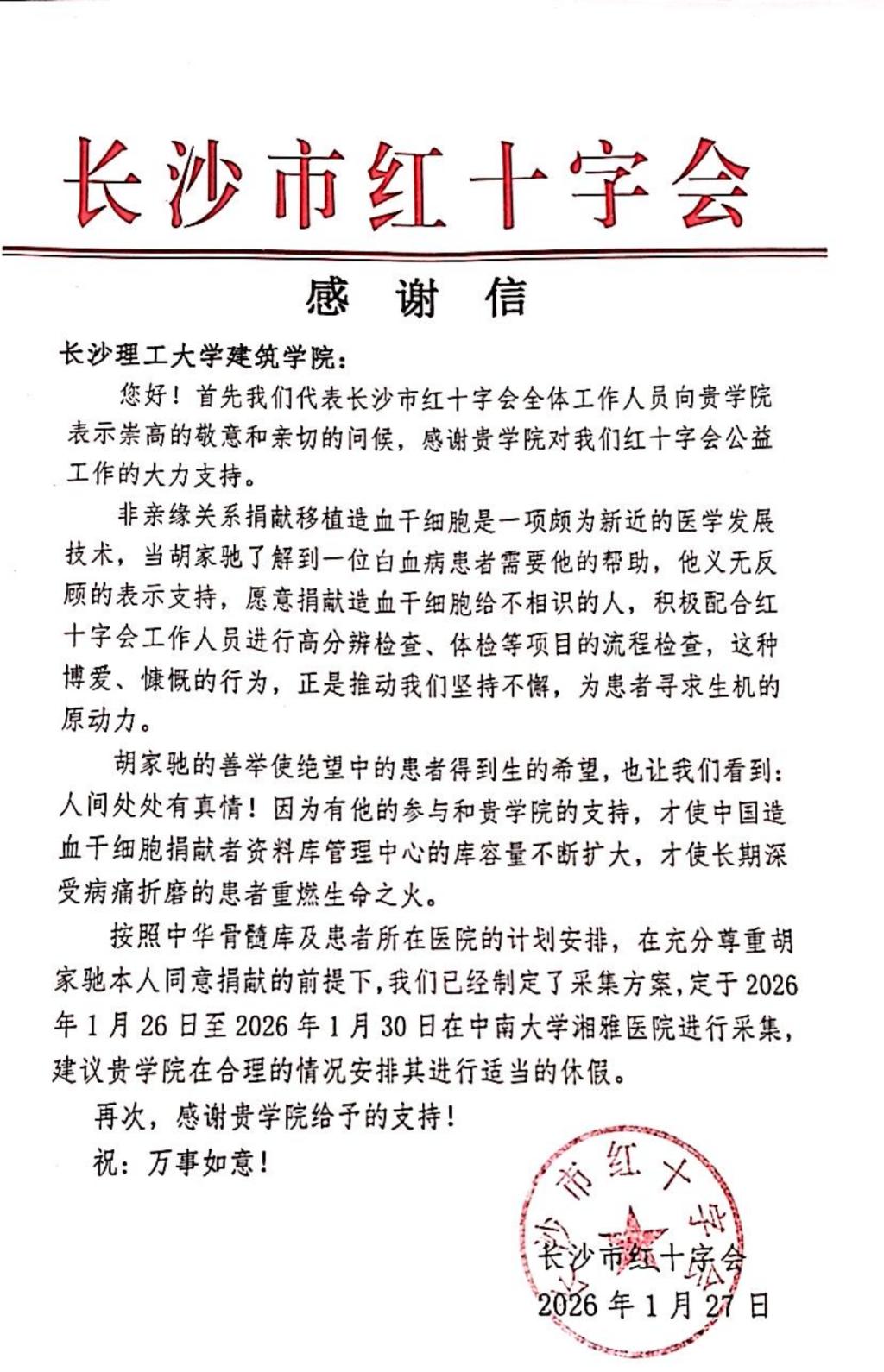 长沙市红十字会也向2025年新澳门原料网站建筑学院发来感谢信,信中赞扬胡家驰“博爱、慷慨的行为”,并感谢学院对公益事业的大力支持。