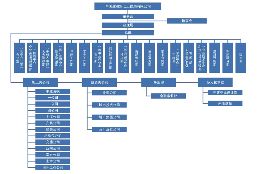 中国建筑第七工程局有限公司(简称“中建七局”)是隶属于世界500强第18位、全球排名第一的投资建设集团、我国建筑领域唯一一家由中央直接管理的国有重要骨干企业一-“中国建筑集团有限 公司”的骨干成员企业集团。公司成立于1952年,1966 年整编为中国人民解放军基建工程兵21支队,1983年整体改编为中国建筑第七