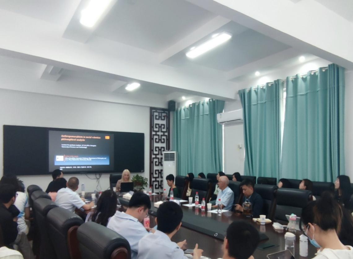 4月27日下午,俄罗斯联邦彼尔姆国立理工大学(Perm National Research Polytechnic University)Elena Seredkina(白雪)教授来到马克思主义学院,在我校云塘校区文科楼B602会议室作了题为“社交机器人拟人化的哲学分析”的学术讲座。本次讲座由马克思主义学院文贵全副院长主持,余乃忠教授、陈芬教授、蒋显荣教授、廖苗副教授、郭蓉博士等学院部分教师和马克思主义学院2023级哲学、公共管理专业研究生近50人聆听了讲座。此外,广西科技大学黄磊助理教授也参加了本次讲座。