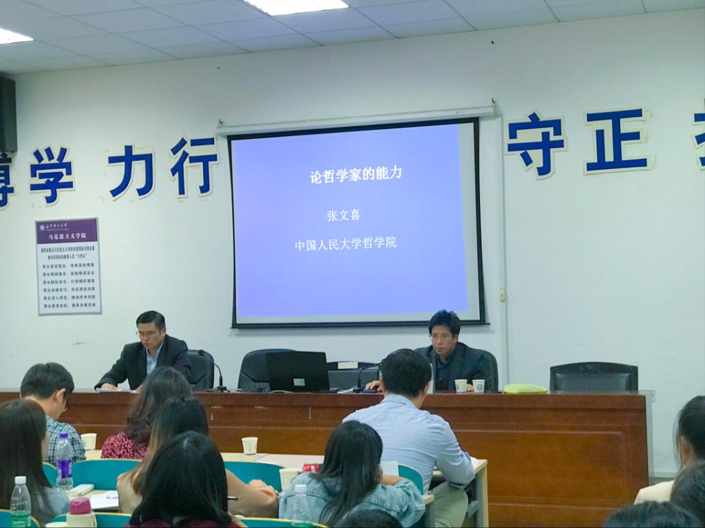 2018年10月12日下午14点,中国人民大学哲学院博士生导师、张文喜教授,应邀在我校云塘校区文科楼C202报告厅进行了题为“论哲学家的能力”的学术讲座。我校马克思主义学院陈万球院长、张明海副院长、部分教师和全体研究生聆听了此次讲座。讲座由马克思主义学院院长陈万球教授主持。