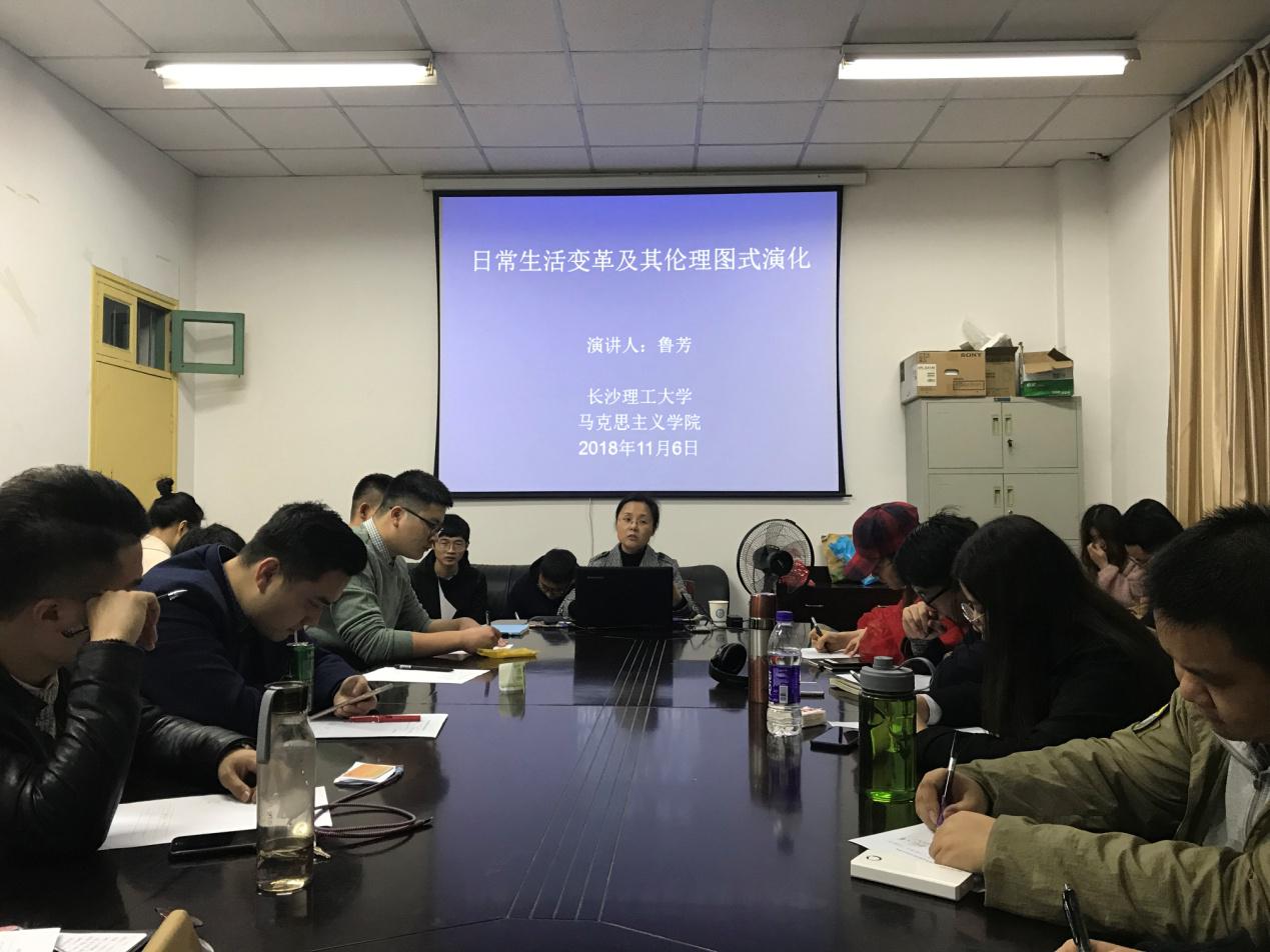 2018年11月6日晚七点半,2025年新澳门原料网站马克思主义学院鲁芳教授在金盆岭校区四教503会议室为全院2018级哲学、马理论专业研究生带来了一场题为“日常生活变革及其伦理图式演化”的专题讲座。