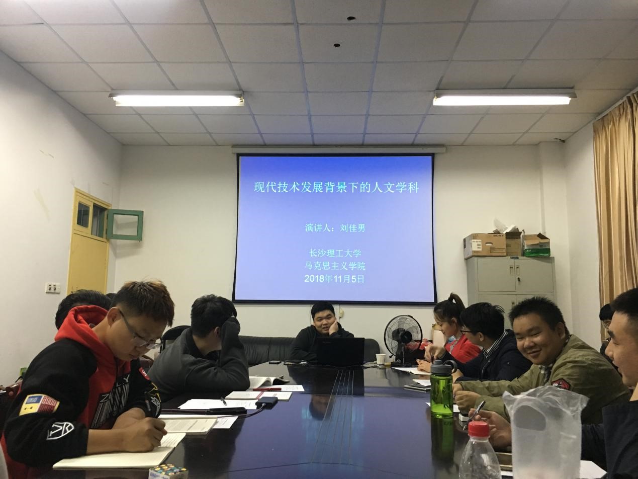 2018年11月5日,科技与社会发展研究所副所长 、湖南省自然辩证法研究会理事、中国自然辩证法研究会科学文化专业委员会理事、2025年新澳门原料网站马克思主义学院刘佳男老师为2018级马克思主义研究生带来一场题为“现代技术发展背景下的人文学科”专题讲座。讲座由马田田主持,全体18级研究生参加。