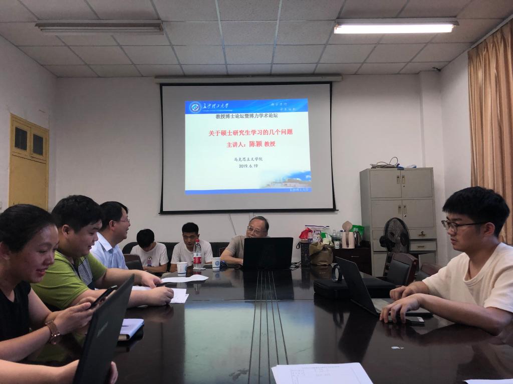 2019年6月19日晚7时,马克思主义学院教授、硕士生导师、校教学督导团成员陈颖教授,应邀在金盆岭校区4教503室主讲了题为“关于硕士研究生学习的几个问题”的学术讲座。马克思主义学院廖苗博士、刘佳男博士、马涛博士、赵兵博士、黄伟博士等青年教师和30多名研究生参加了此次讲座。讲座由院学科办主任文贵全博士主持。
