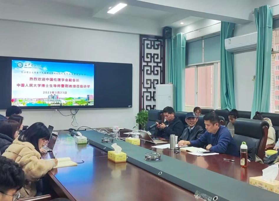 3月23日下午,中国伦理学会副会长、中国人民大学博士生导师曹刚教授应邀来到马克思主义学院,做客我校第十九届博力学术论坛马克思主义学院分论坛,在云塘校区文科楼马克思主义学院会议室作了“关于智能社会的道德想象”的学术讲座。院党委陈万球书记、唐俊副院长、王威峰副院长,陈芬教授、钟芙蓉副教授等学院教师和研究生参加了此次讲座,本次学术论坛由学院院长张明海教授主持。