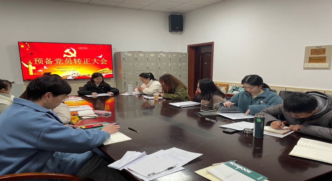 2021级研究生党支部于2022年1月4日上午10点在4教501教室举行预备党员转正大会,大会主要是讨论表决关于童瑶、杨珺、胡澜三位同志能否如期转正。此次转正大会由组织委员吴彩虹主持,支部全体党员按时到会。