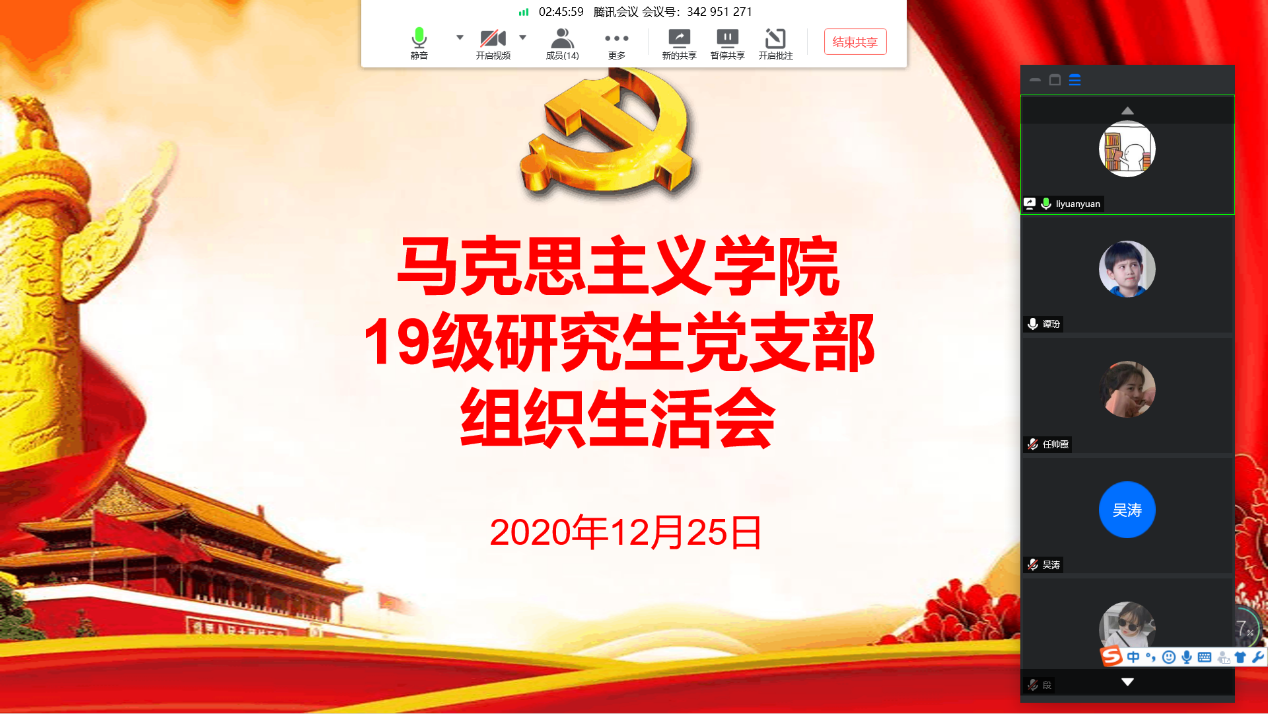 马克思主义学院2019级研究生党支部于2020年12月25日晚7点30分召开了线上组织生活会。会议围绕“不忘初心、牢记使命”的主题举行,由党支部书记李袁远同志主持,全体支部党员和预备党员参加。本次组织生活会严格按照相关要求,会前精心组织,会中认真落实。