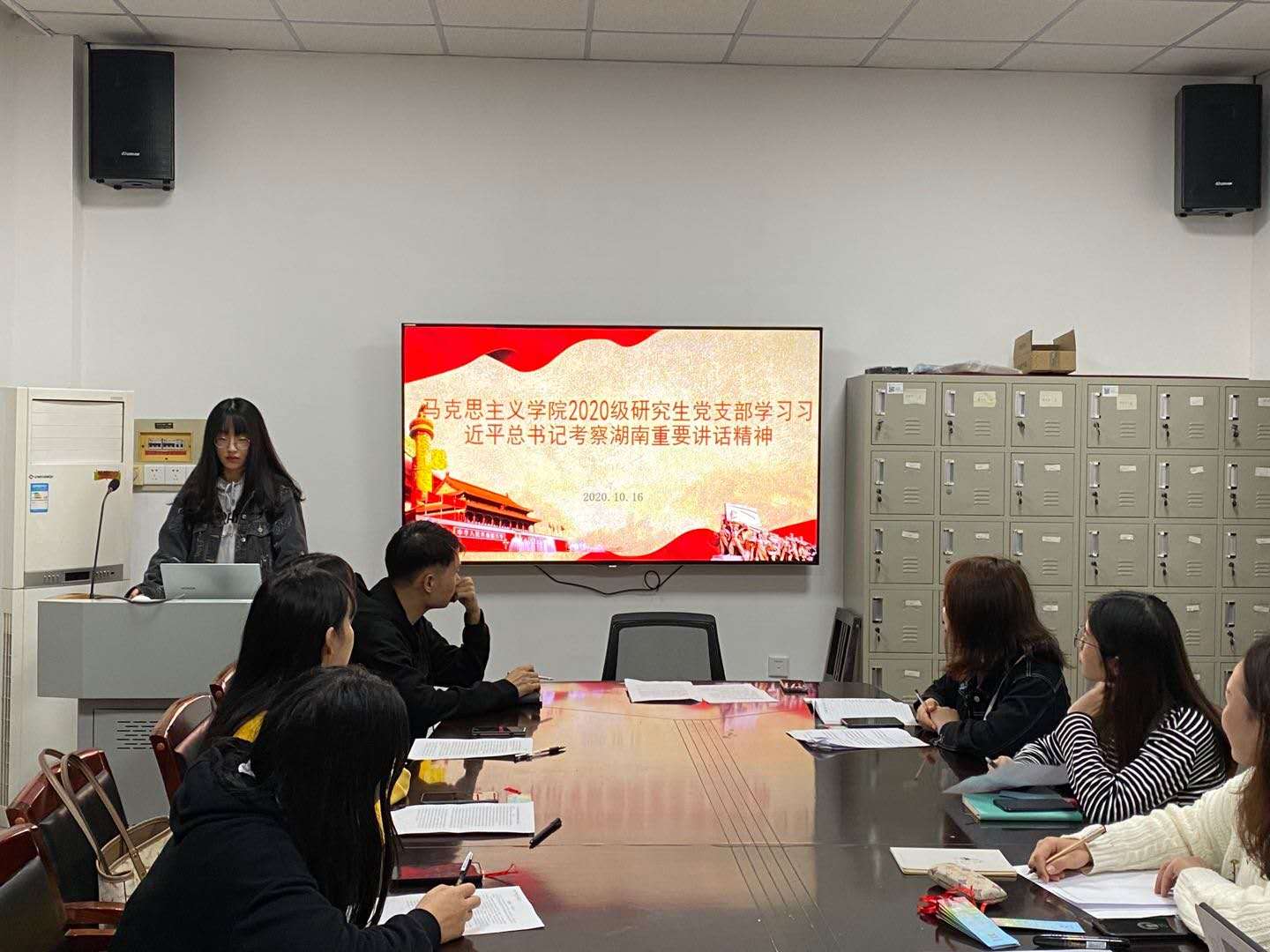 2020年10月16日,马克思主义学院2020级研究生党支部在金盆岭校区四教503教室,开展了学习习近平总书记考察湖南重要讲话精神的专题学习活动。本次学习由党支部书记王静怡领学,支部全体党员参加。