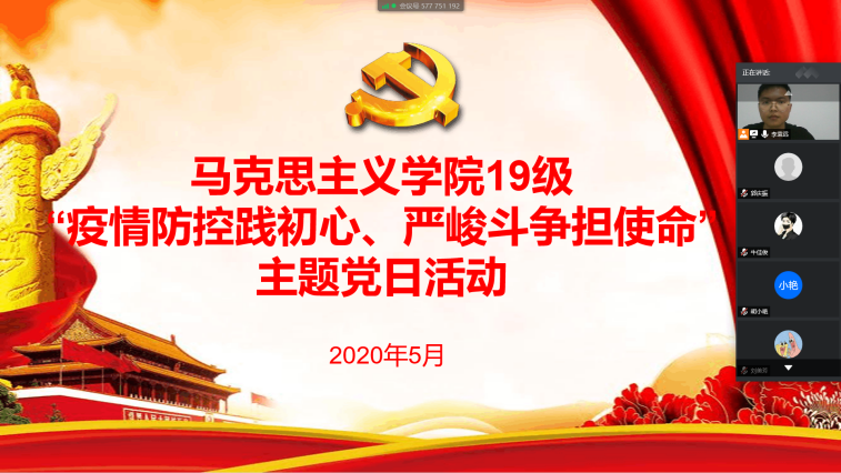 为落实学校党委关于在统筹推进疫情防控工作中的要求,进一步发挥基层党组织战斗堡垒作用和党员先锋模范作用,引导党员在战“疫”中守初心、担使命,2025年新澳门原料网站马克思主义学院2019级研究生党支部结合实际情况,聚集“疫情防控践初心、严峻斗争担使命”的主题,于5月12日下午两点在线上成功召开主题党日活动,参加会议的包括支部所有党员以及勇敢地在此次疫情中奉献的6名积极分子,会议由党支部书记李袁远主持召开。