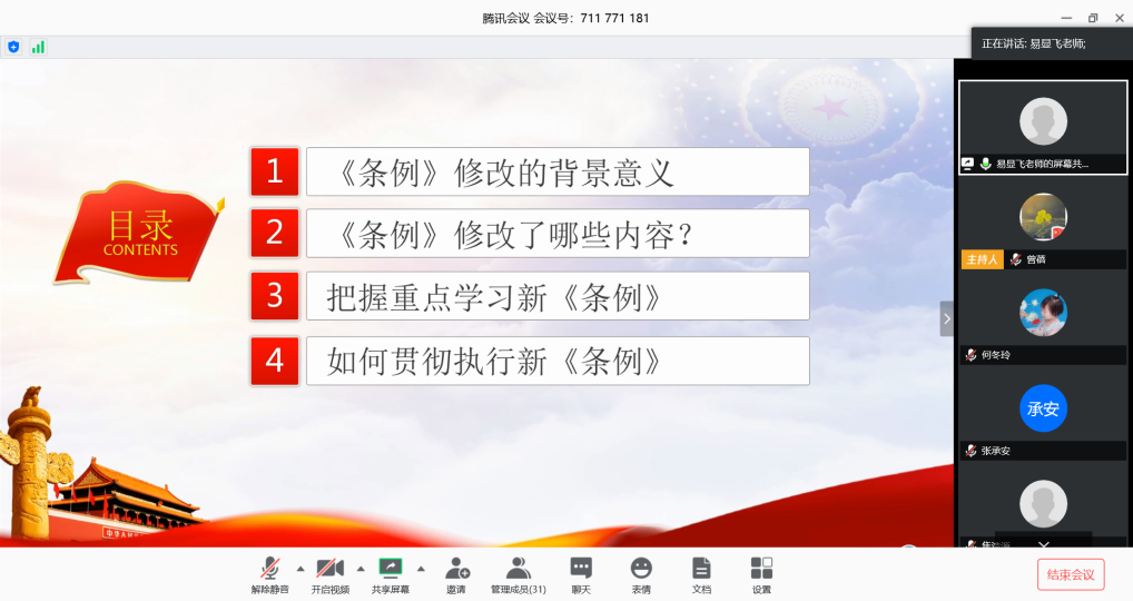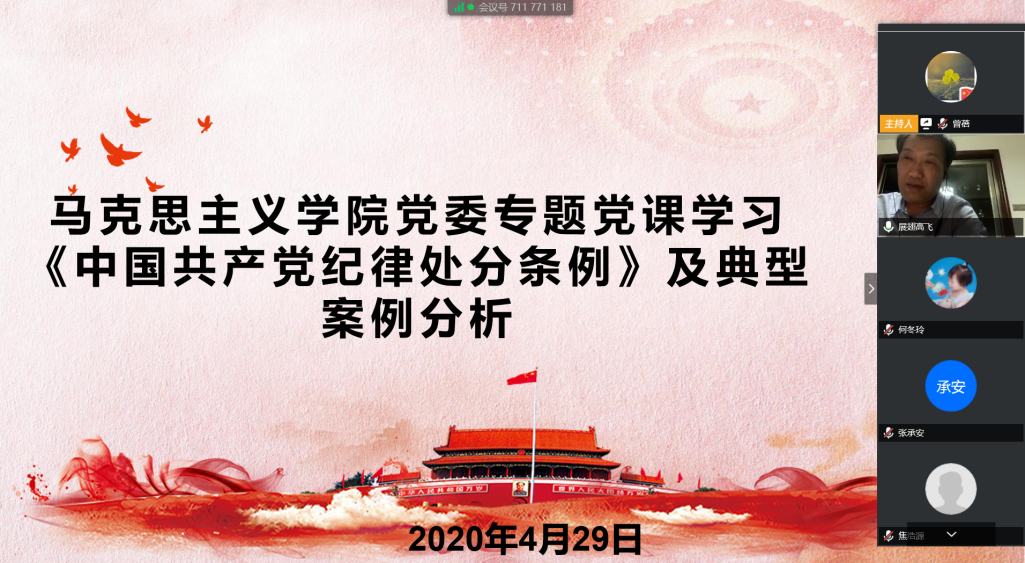 进一步严格落实学校党委关于全面从严治党治校的有关精神,马克思主义学院党委中心组2020年4月29日19:30在线进行了专题党课学习此次专题党课学习的主题是中国共产党纪律处分条例及典型违纪案例分析”,由学院党委书记易显飞教授主讲。学院党政班子、各支部书记及支委、各系主任副主任工会主席及工会委员学院行政人员以及2018年以来新入职教师等参加了此次专题学习。马克思主义学院党委副处级组织员周展同志主持了此次专题学习。