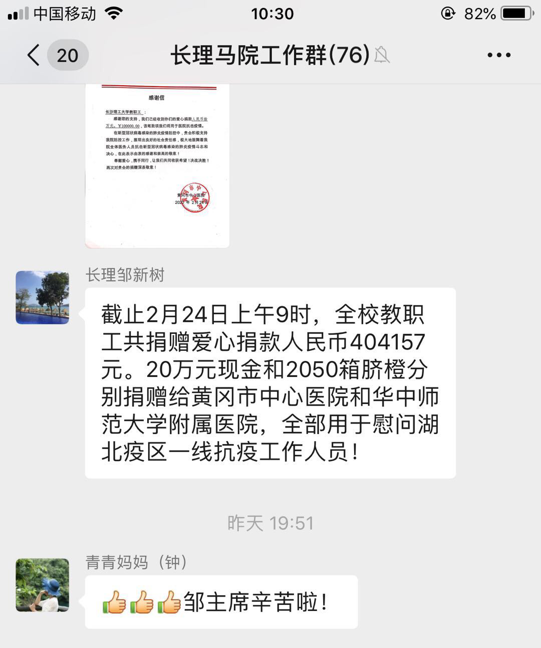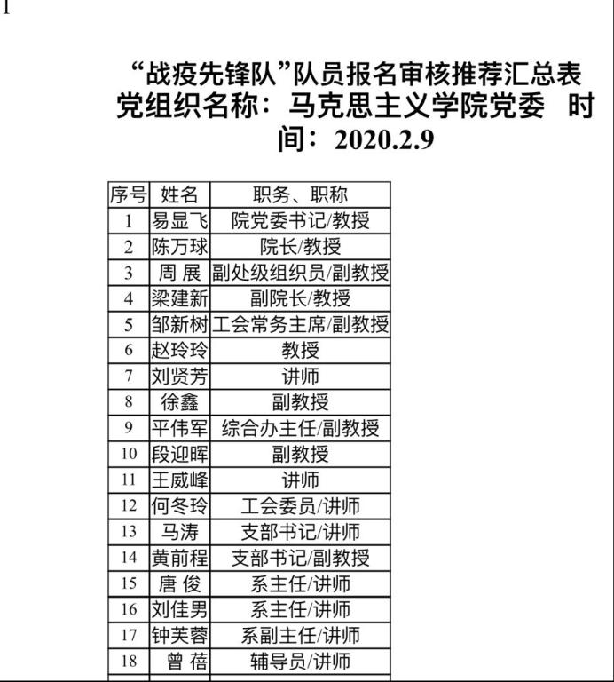 27日学校招募“战役先锋队”,邹老师说“我是老党员,我报名。”“截止到目前,马院参与学校橙心橙意·助力抗疫捐赠的老师共有59人61次。谢谢美丽的你爱心之举。215日学校工会发起了与对口扶贫村共同助力湖北抗“疫”的爱心活动,邹老师带头响应并向全院教师积极发动捐赠、及时公布进程,让更多的爱快速汇集。“亲爱的老师们,按时健康打卡啦。教育部、学校每天惦记我们的身体健康,想想都幸福。”217日起学校要求每位老师进行健康打卡,邹老师戴着老花镜提前摸索网站和APP两种打卡方式的注意细节,耐心解答、沟通每个老师打卡时遇到的问题,每天准时温馨提醒,从细微处温暖着保护着全院每一位老师。217日起邹老师还是2个班本科班和2个研究生班近400名学生中国特色社会主义理论相关课程的任课老师,组建班级群、设计教学、上传资料、组织线上互动与作业批改,做为大“疫”情下“停课不停教”线上行的老“新兵”,邹老师说他要更加用心,他要通过课程引导学生树立起抗“疫”从我做起的耐心、对中国特色社会主义制度的信心、励志为中华民族复兴而奋斗的决心。