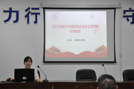 高小枚同志围绕“习近平新时代中国特色社会主义思想的科学体系”这一主题进行了详细生动的分析。她认为,新思想之所以是科学的理论体系,首先在于它坚持了马克思主义的科学世界观和方法论,比如实事求是、人民立场、全局视野、矛盾分析、唯物史观、居安思危、解放思想等。其次,新思想的科学体系还体现在它的丰富内容、完整结构上,它揭示了经济、政治、文化、社会、生态等方方面面的基本理论。最后,新思想形成了一系列科学而又富有创见的基本观点,如对新的历史方位的判断、主要矛盾的判断、“两山论”、中国经济步入新常态等。高小枚同志强调,只有深入把握习近平新时代中国特色社会主义思想的科学体系,才能更好领略这一思想的基本轮廓和总体面貌,更更好地领会这一思想的丰富内涵、深厚底蕴及实践要求。