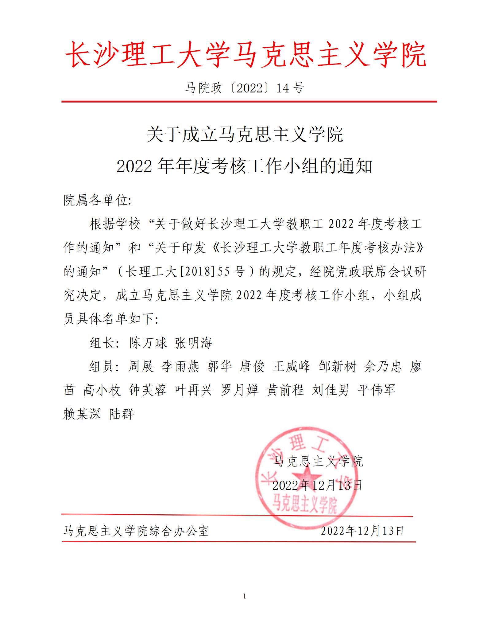 关于成立马克思主义学院2022年年度考核工作小组的通知(马院政【2022】14号)